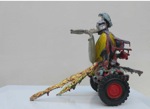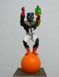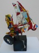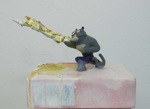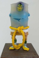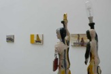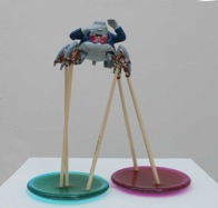 dape macht was daraus. Er verändert diese vordefinierten Bildgeber und baut daraus Objekte, indem er ihnen Alltagsgegenstände, dingliche Kommentare, neue Farben und andere Versatzstücke beigibt. Ein bisschen Acryl. Ein bisschen Blattgold. Ein bisschen Öl. Ein echtes Ready-made. Der Name Ready-made geht auf Marcel Duchamp zurück, der seit 1913/14 Objekte des täglichen Gebrauchs aus ihrer üblichen Umgebung holte und als Kunstwerke deklarierte. Sein mit der Fahrradgabel auf einem Küchenhocker montiertes drehbares Vorderrad eines Fahrrades gilt als erstes Ready-made-Objekt und als erste bewegbare Plastik. dape geht über Duchamp hinaus. Seine Objekte werden degradiert, bevor sie frisch montiert und farblich frisiert neu summiert reinkarnieren können. Er verletzt seine Helden, entmachtet, entkräftet und deformiert sie. Und er gibt ihnen den Beigeschmack des Scheiterns, des sentimentalen Moments, des traurigen Helden. Angereichert mit Werbeikonen, Schriftträgern und bizarren Titeln – ich erinnere hier exemplarisch an Nordmende Master oder „Dance With Me“ Master – ahnen die Rezipierenden Gegenwart, Botschaft und Absicht. Doch der Code wird vielerorts und auch hier erst beim zweiten Denk geknackt. Bilder des Be- und Gefangenseins, des rasenden Stillstands in einer betont dynamisch-kraftvollen Welt voller medial vermittelter Heroen, blinkerbunter Leitbildsimulationen und wertig anmutenden Glanzabbildern bleibt die Frage nach dem Sinn des Funktionierens häufig zurück. dape entrückt. Seine Figuren atmen ein Lebewohl. Einen Abschied als Einstieg in eine andere Seinsebene.